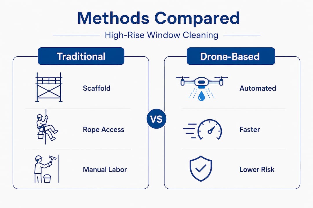 Do drones fully replace manual window cleaning for high-rises?